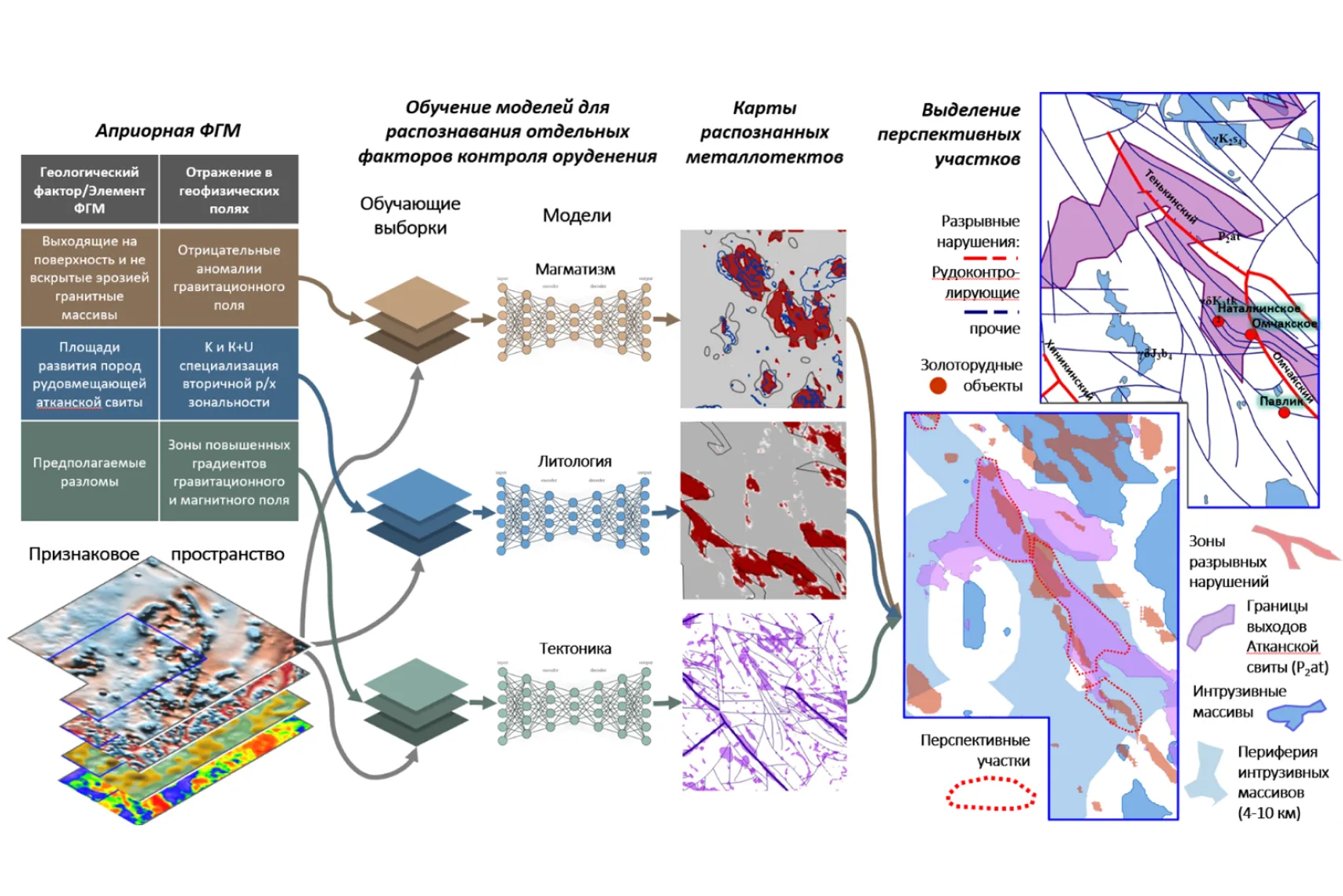 За геологическую основу взяли модель Омчакского рудного узла — это концептуальная схема, описывающая, как устроен узел: какие геологические структуры, породы и признаки указывают на присутствие золота. Априорная геолого-геофизическая модель помогает понять, какие именно признаки надо «показать» нейросети, чтобы она научилась распознавать перспективные зоны. ИИ «смотрит», как выглядят такие зоны по геофизике, геохимии и геологии, чтобы затем находить похожие участки в других регионах.