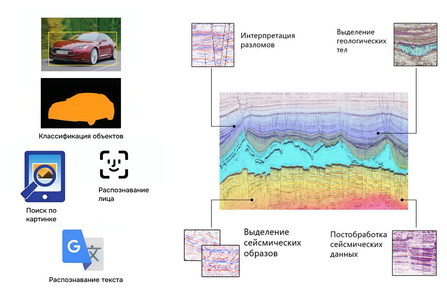 В геофизике искусственный интеллект работает по тому же принципу, что и в других сферах — он распознаёт образы. Только в нашем случае это не фотографии или тексты, а сейсмические данные. Алгоритмы находят закономерности в кубах и автоматически выделяют геологические структуры: горизонты, разломы, палеоканалы, рифы и т. д. По сути, это та же логика «распознавания объектов», но перенесенная на язык геологии.