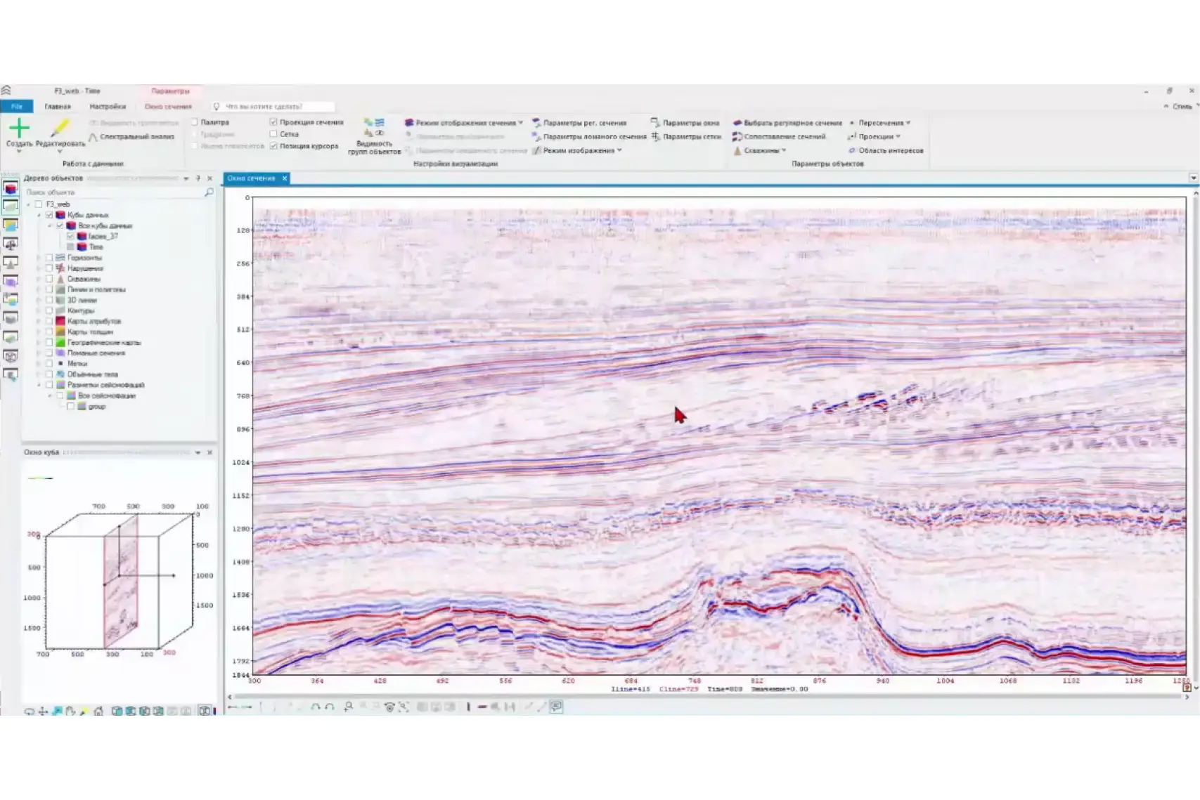 - Интерпретация — это уже работа с готовыми сейсмическими кубами объёмом от нескольких до сотен гигабайт. С ними можно работать на локальных машинах под Windows и Linux: просматривать изображения, коррелировать горизонты и разломы, выполнять динамический анализ.