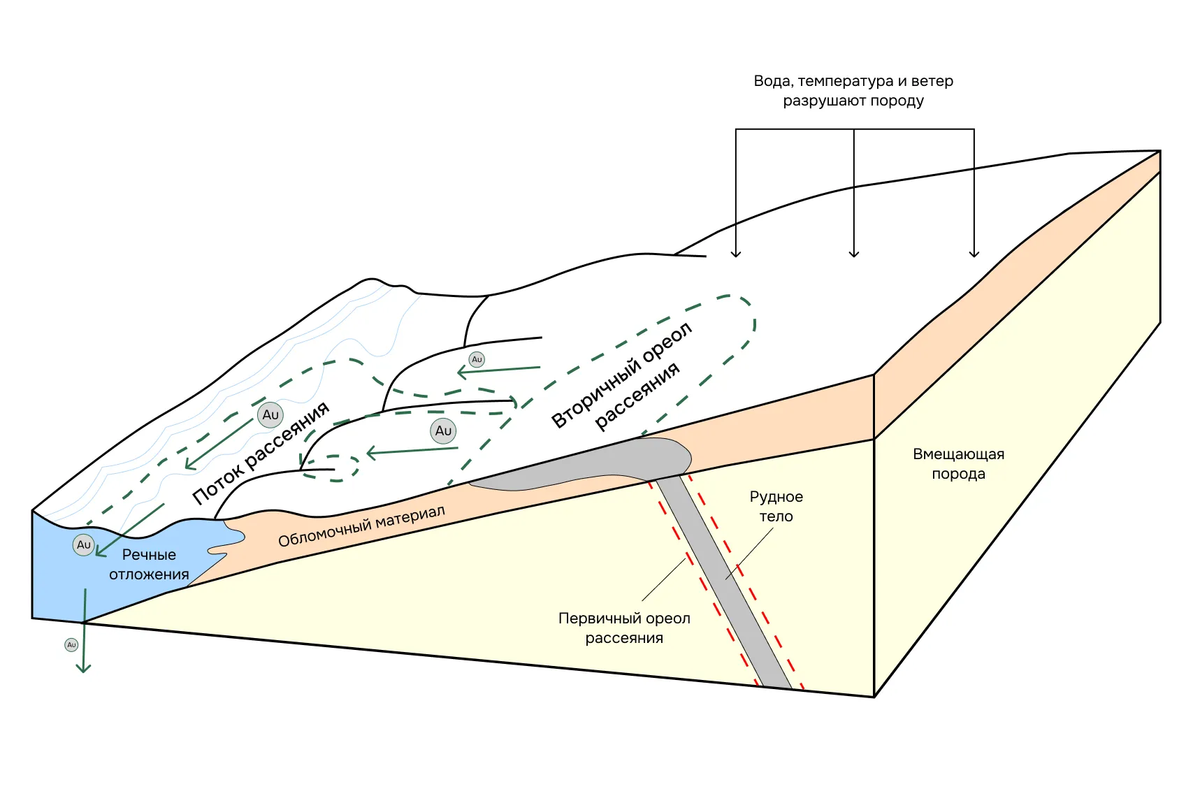 Простой пример: на склоне образовалась золотая жила. Она постепенно разрушается под действием воды — универсального растворителя. Вокруг жилы формируется первичный ореол, ниже по склону — вторичный. А ручьи размывают эти отложения и уносят частицы золота на километры вниз. Если взять пробы шлиха — тяжёлых минералов, промытых из породы — и обнаружить в них золото, значит, где-то в зоне водосбора находится его источник.