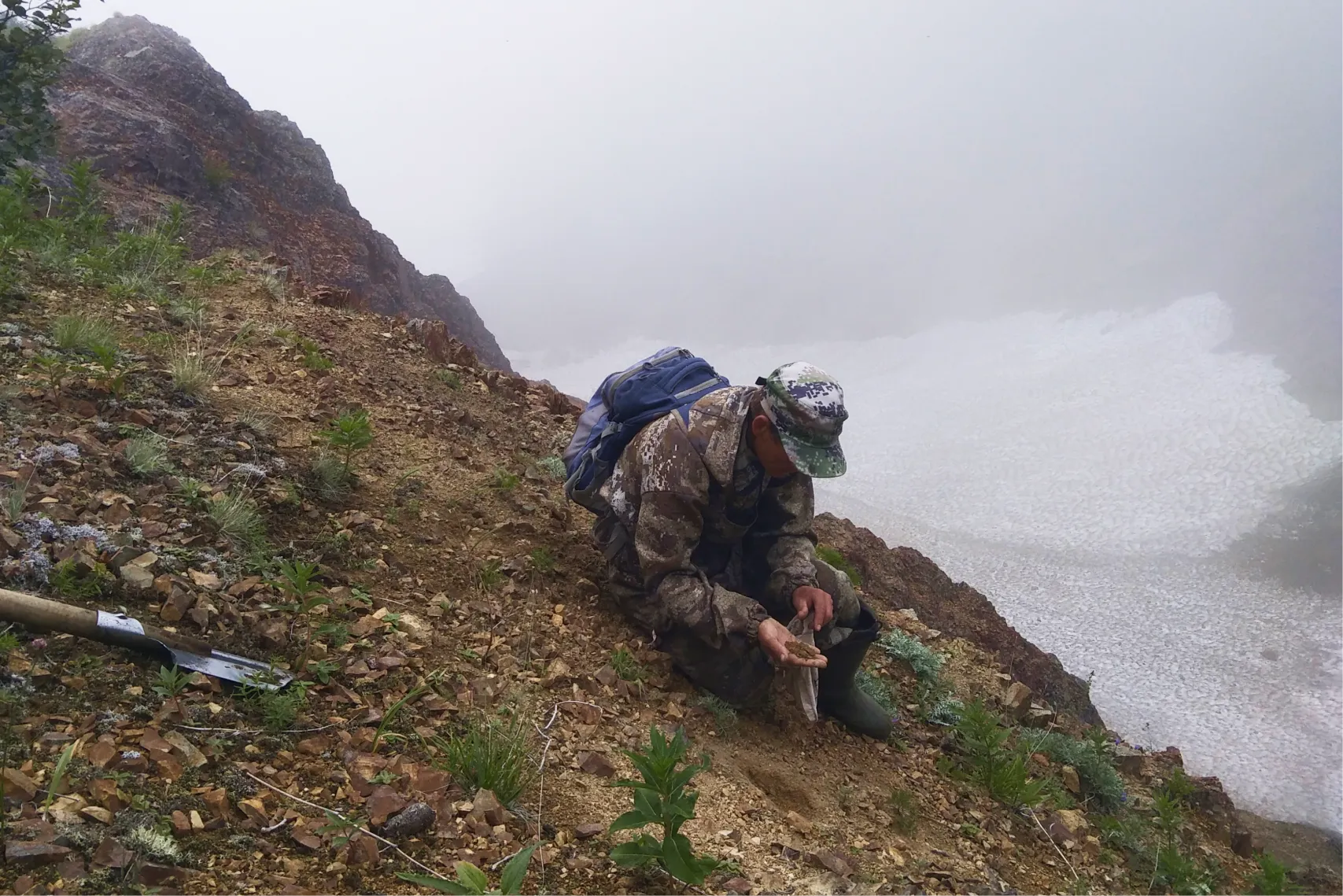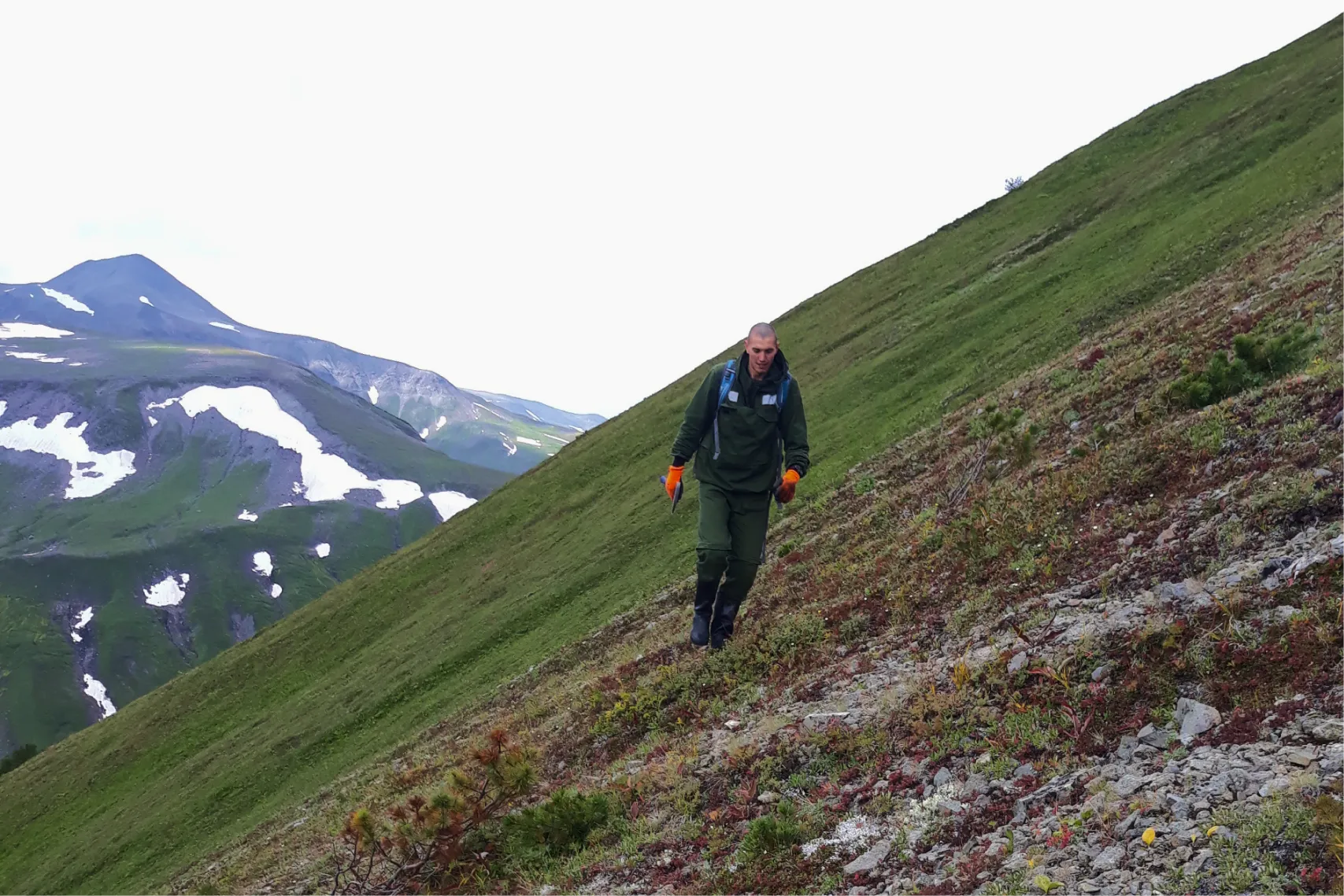 «Мы, конечно, работали с нарушением техники безопасности — ходили в дождь. Но там даже сложно сказать, дождь это или нет, потому что ты работаешь в низкой облачности. Когда поднимаешься в гору, ты буквально ходишь в облаке, в мокром тумане. Поэтому, как бы ты ни старался этого избежать, все равно постоянно ходишь сырой. И этот стланик — он тоже сырой. Только прошел — и уже мокрый».