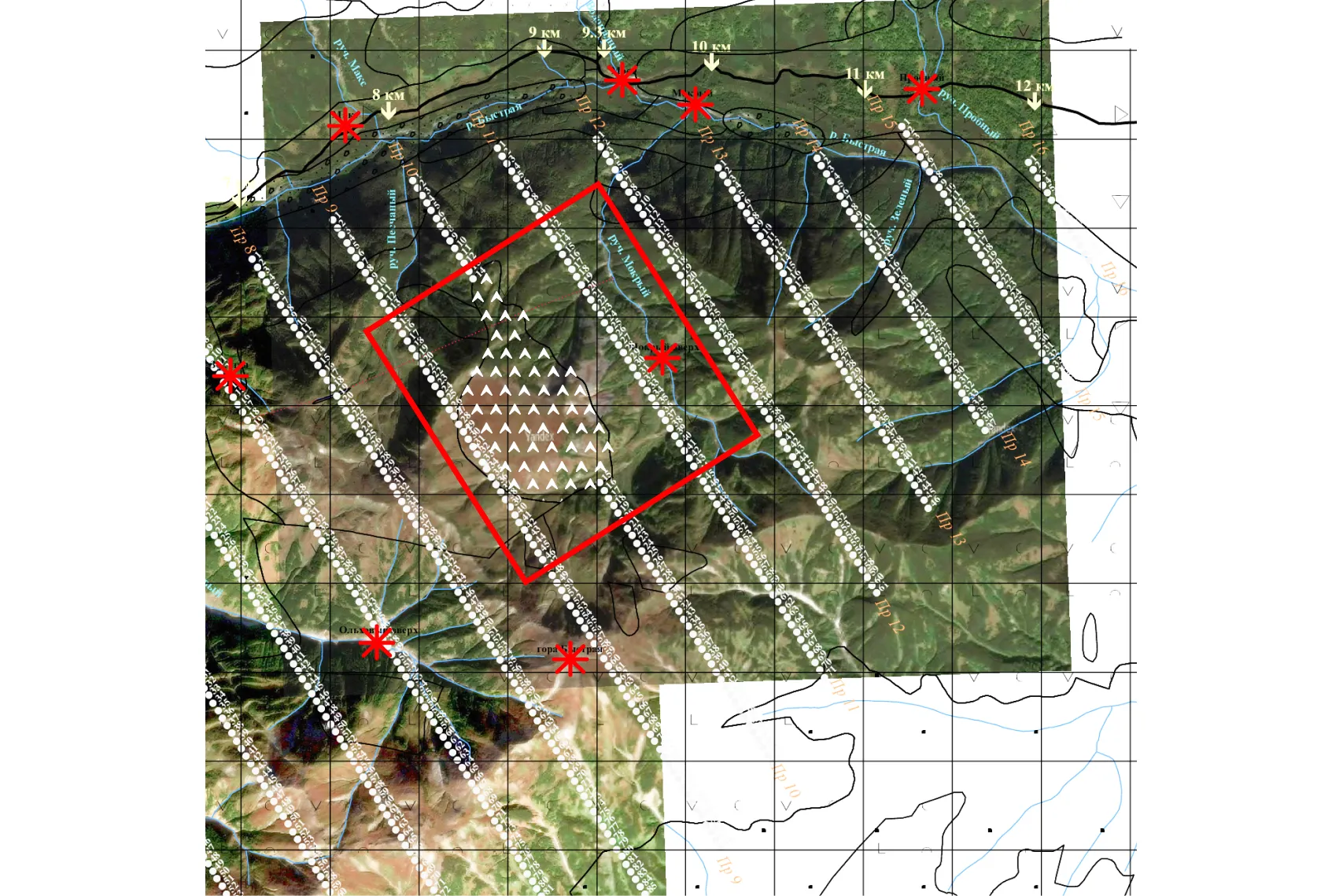 Схемы маршрутов руководитель разрабатывал заранее, с учетом особенностей рельефа и логистики. Камчатка — не то место, где можно просто пройти от начала профиля до конца: это неэффективно и слишком тяжело. Поэтому пробы собирали фрагментарно, фокусируясь на отдельных зонах. «Ты забрался по ручью наверх — и отработал там квадратик», — объясняет Михаил. При этом высоту старались не терять: подъем и спуск в таких условиях отнимают слишком много сил. «Я лучше пройду 500 метров по горизонтали, чем 200 — но с перепадом высот», — добавляет он.