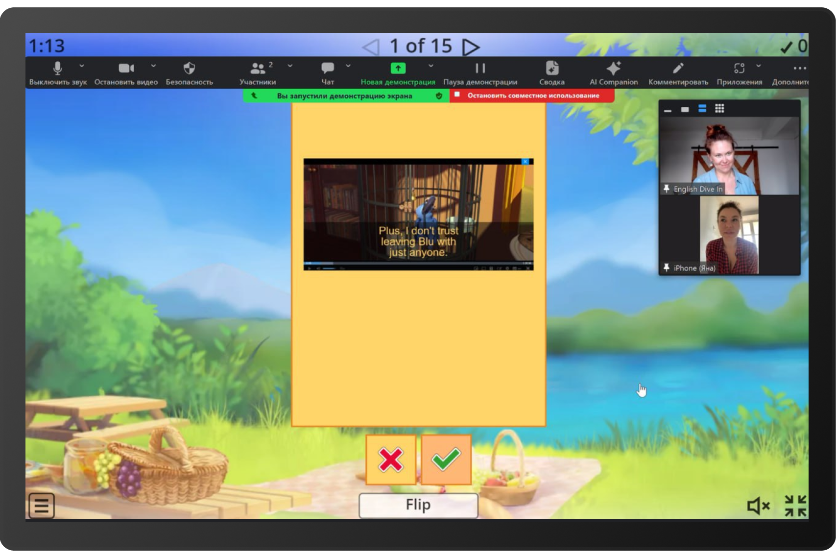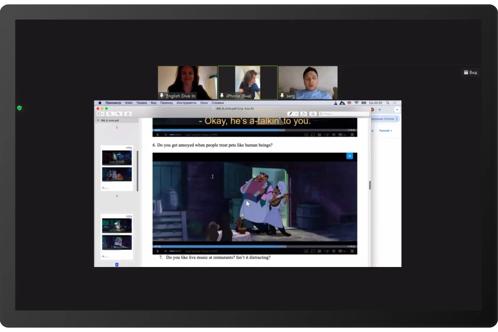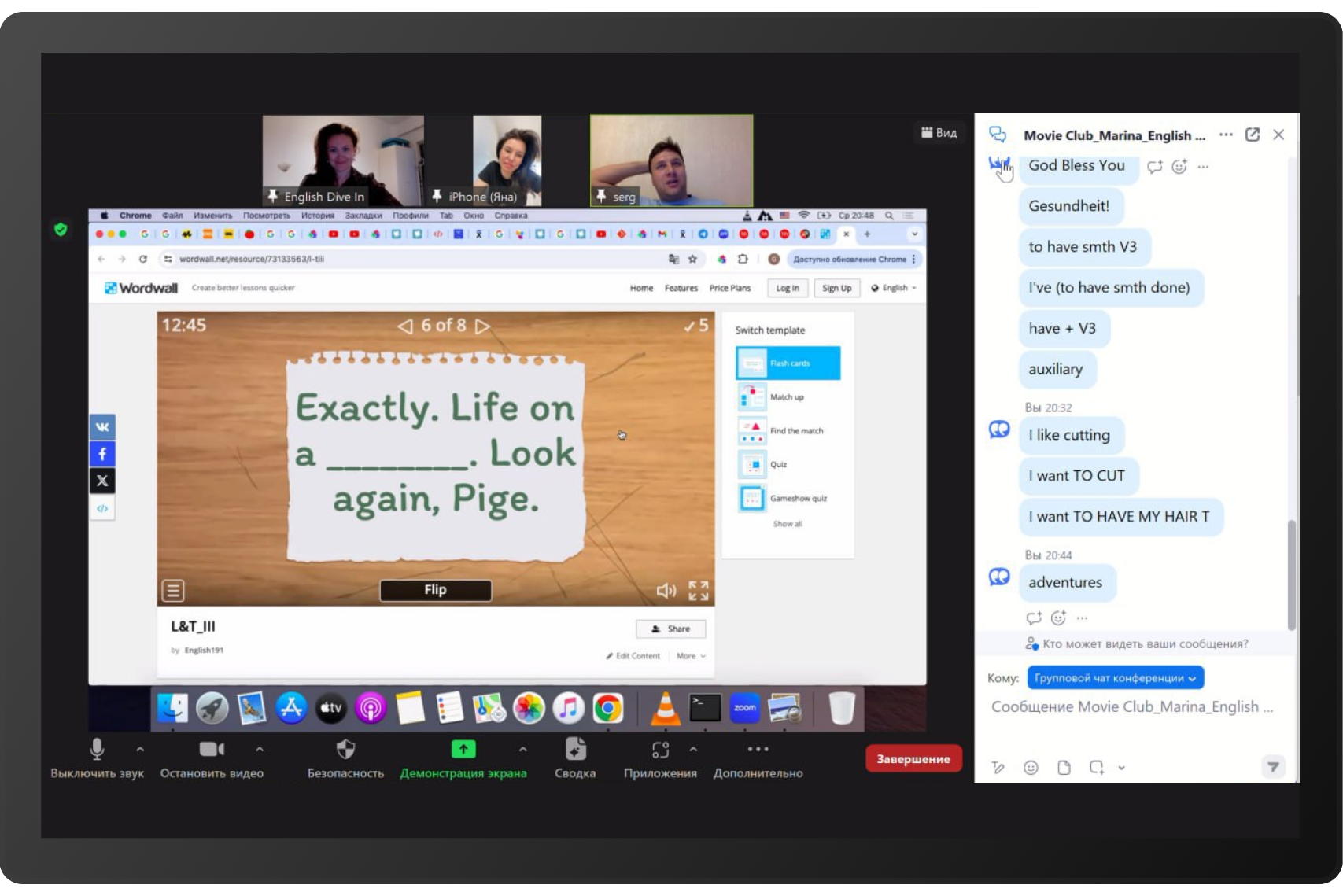 Из этих мыслей родился наш Муви-клуб. Почему я его обожаю? Потому что, с одной стороны, учить язык по фильмам и мультикам — это весело и забавно, но с другой — вы готовитесь дома очень основательно: смотрите нужную часть, работаете со словами, выражениями, идиомами, фразовыми глаголами. Те же фразовые глаголы выучить отдельно очень сложно, нужно учить их в ситуации. Вы увидели сцену и запомнили ее. Вы помните ту или иную фразу благодаря увиденной сцене. Вы готовитесь дома, работаете с этими словами, а потом на встрече обсуждаете действия героев: «а он поступил неправильно, а я бы поступила». Вы обмениваетесь эмоциями, инсайтами. У вас много разговорной практики. И есть список классных слов, которые вы дома выучили, пользуйтесь ими прямо сейчас в разговоре.