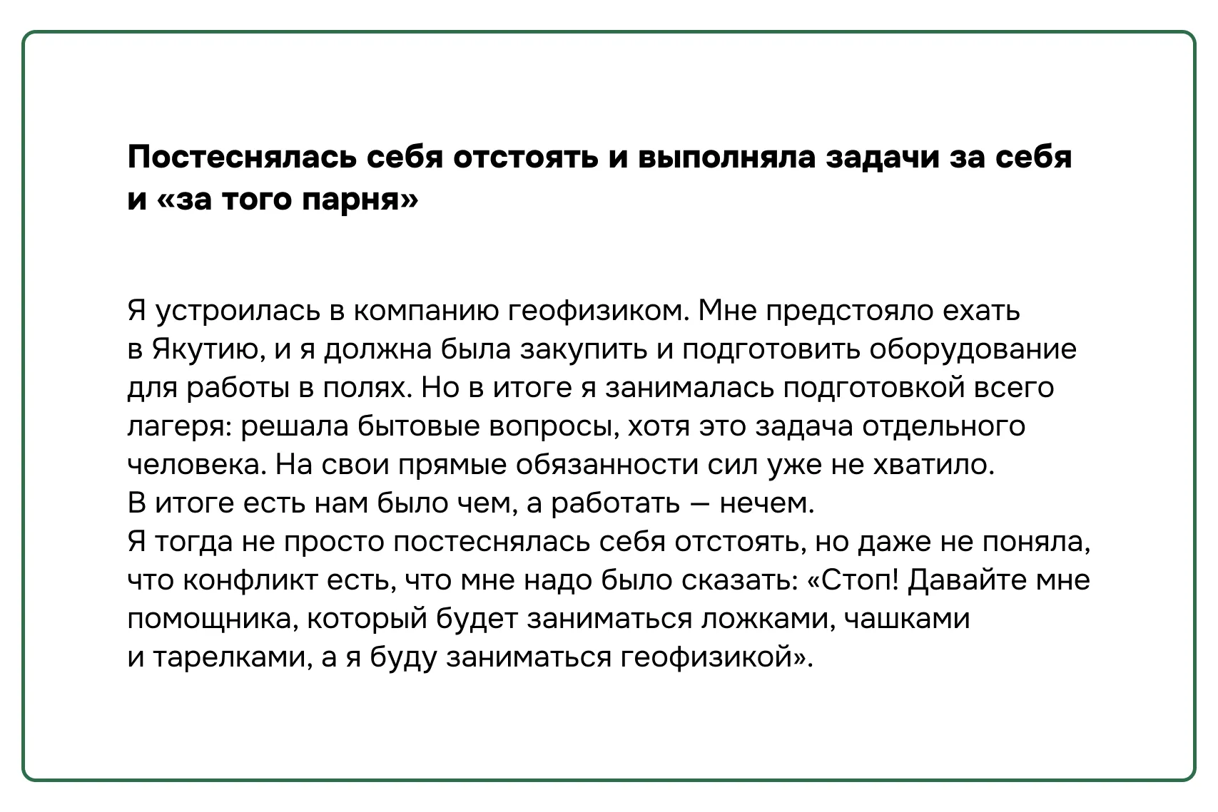 При этом конфликты — неотъемлемая часть работы, потому что работаем мы чаще всего в коллективе. Тем более неизбежны конфликты у полевиков, которые должны находиться с коллегами 24 часа в сутки, то есть не только с ними работать, но и жить бок о бок по несколько месяцев.