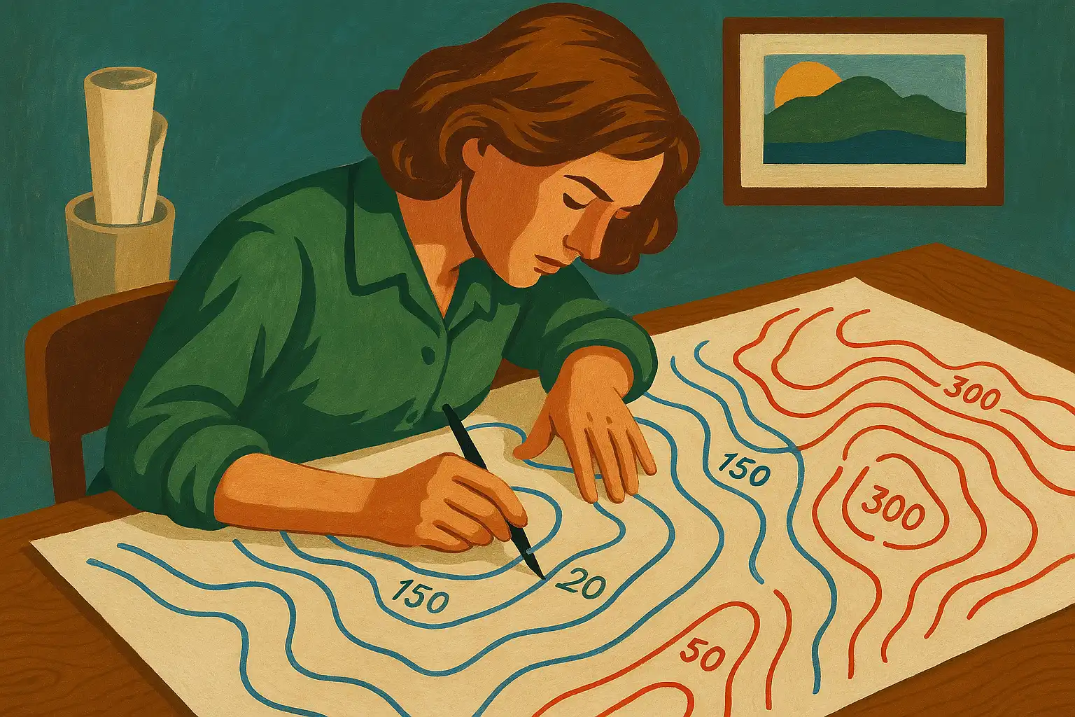 Женщина-геофизик вручную наносит изолинии на геофизическую карту в традиционном стиле 20 века.