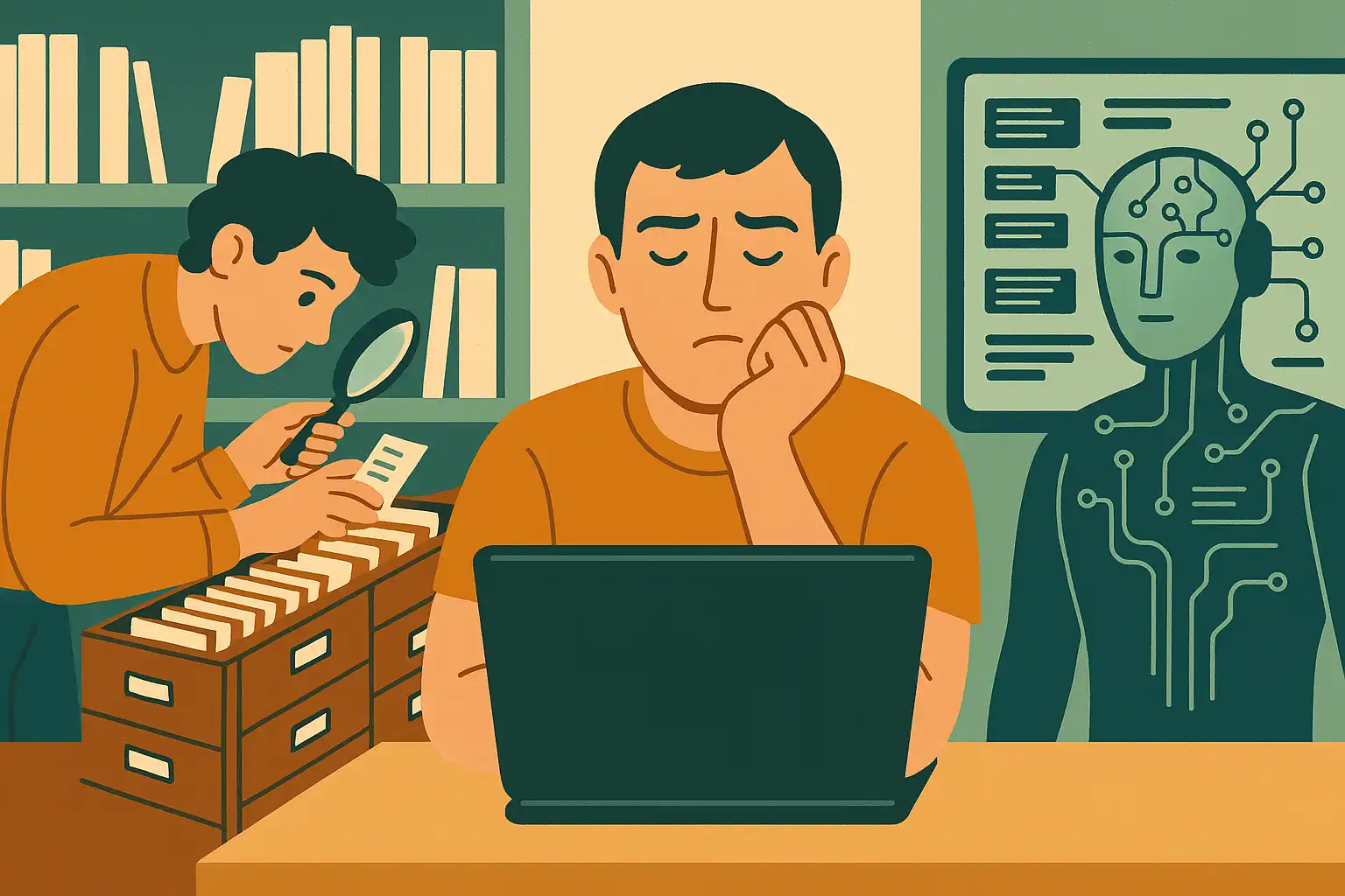 Сравнение: слева — студент с лупой в библиотеке, справа — интерфейс ИИ, в центре — задумчивый человек с ноутбуком.
