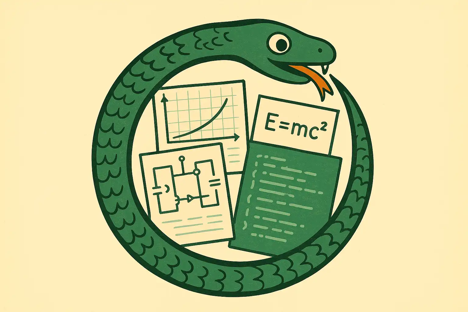 Символ уробороса — змея, кусающая собственный хвост, в окружении цифровых и информационных элементов
