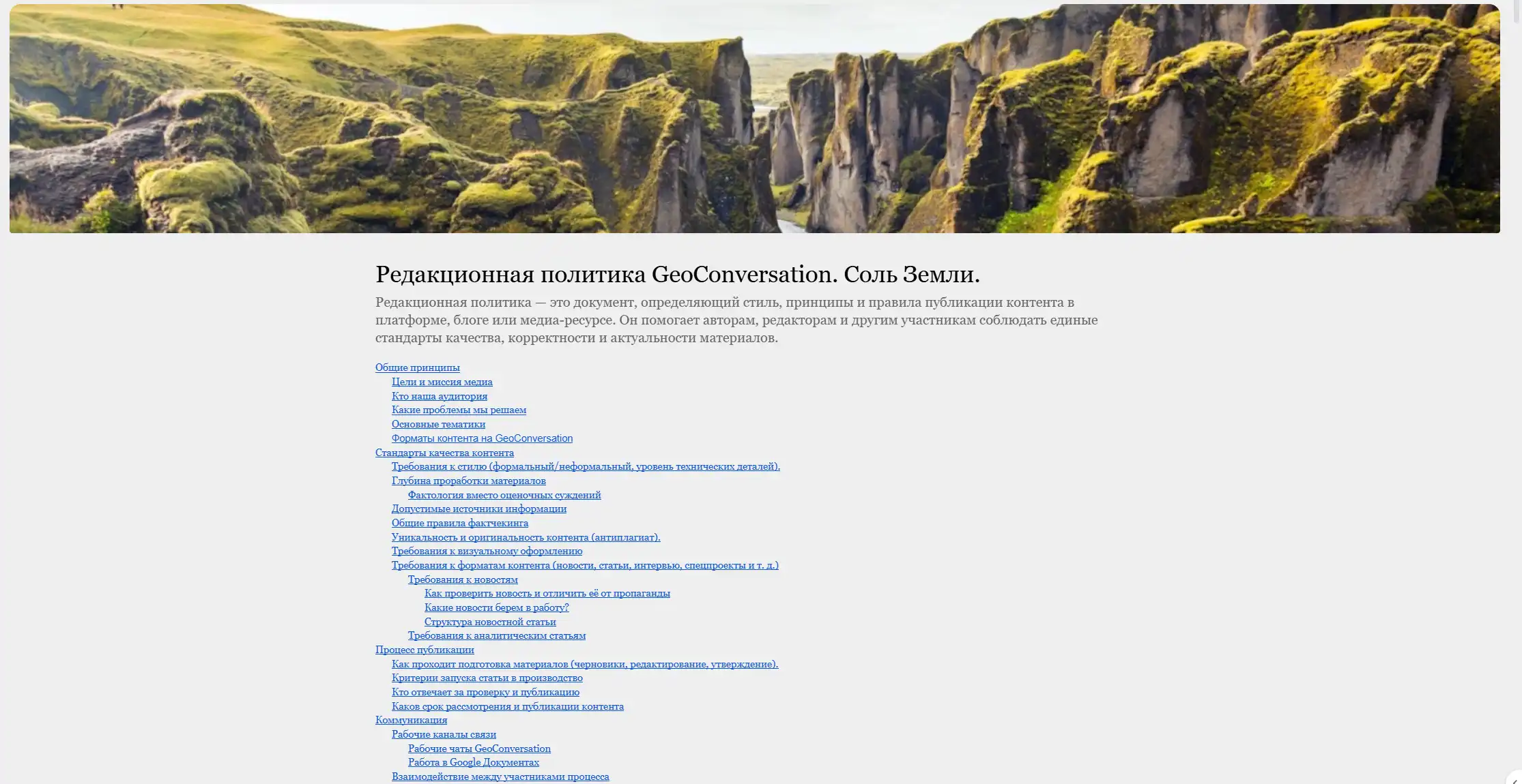 Скриншот оглавления документа «Редакционная политика GeoConversation. Соль Земли» — включает основные разделы и принципы редакционной работы