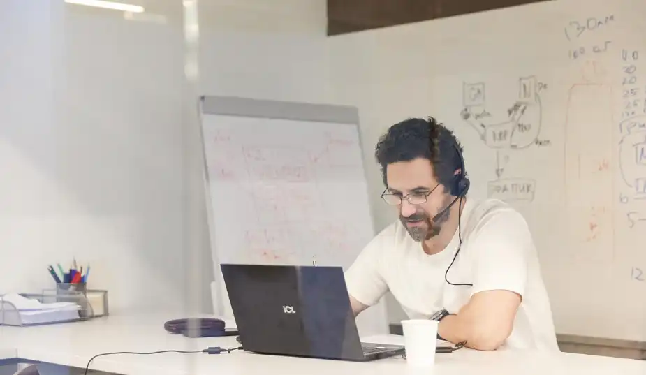 Мужчина с гарнитурой участвует в онлайн-встрече чемпионата Nedra Exploration CUP, обсуждая геологоразведочный кейс