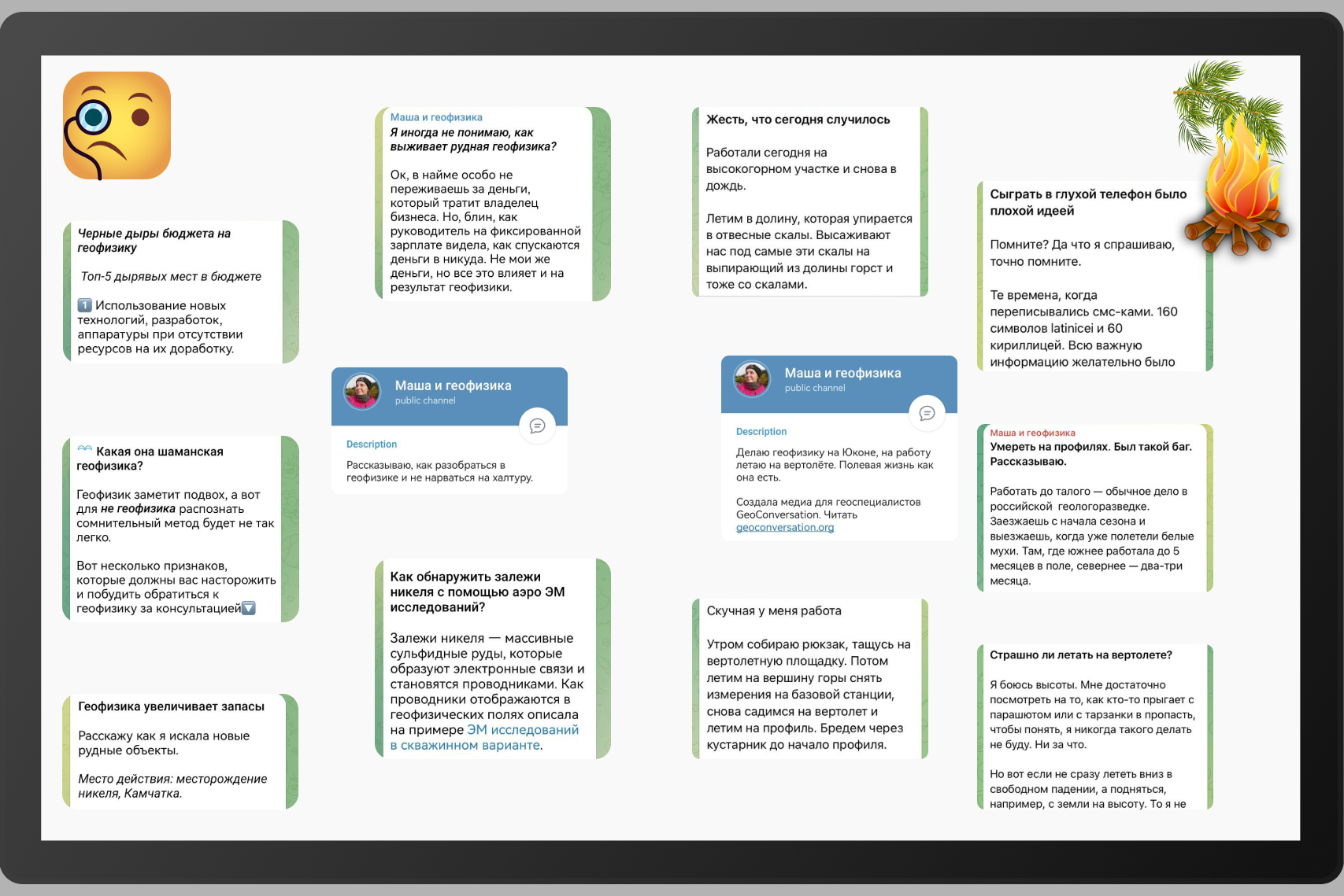 Я создала медиа «GeoConversation. Соль Земли» для специалистов, которые работают в горной отрасли. В медиа я публикую интересные и полезные статьи, которые помогают нам лучше понимать работу друг друга и совместно работать на общую цель. Геолог знает, как работает геофизик и понимает, как ставить ему задачу и принимать результаты работы. Еще я публикую статьи, как пройти интервью или не бросить учить английский.