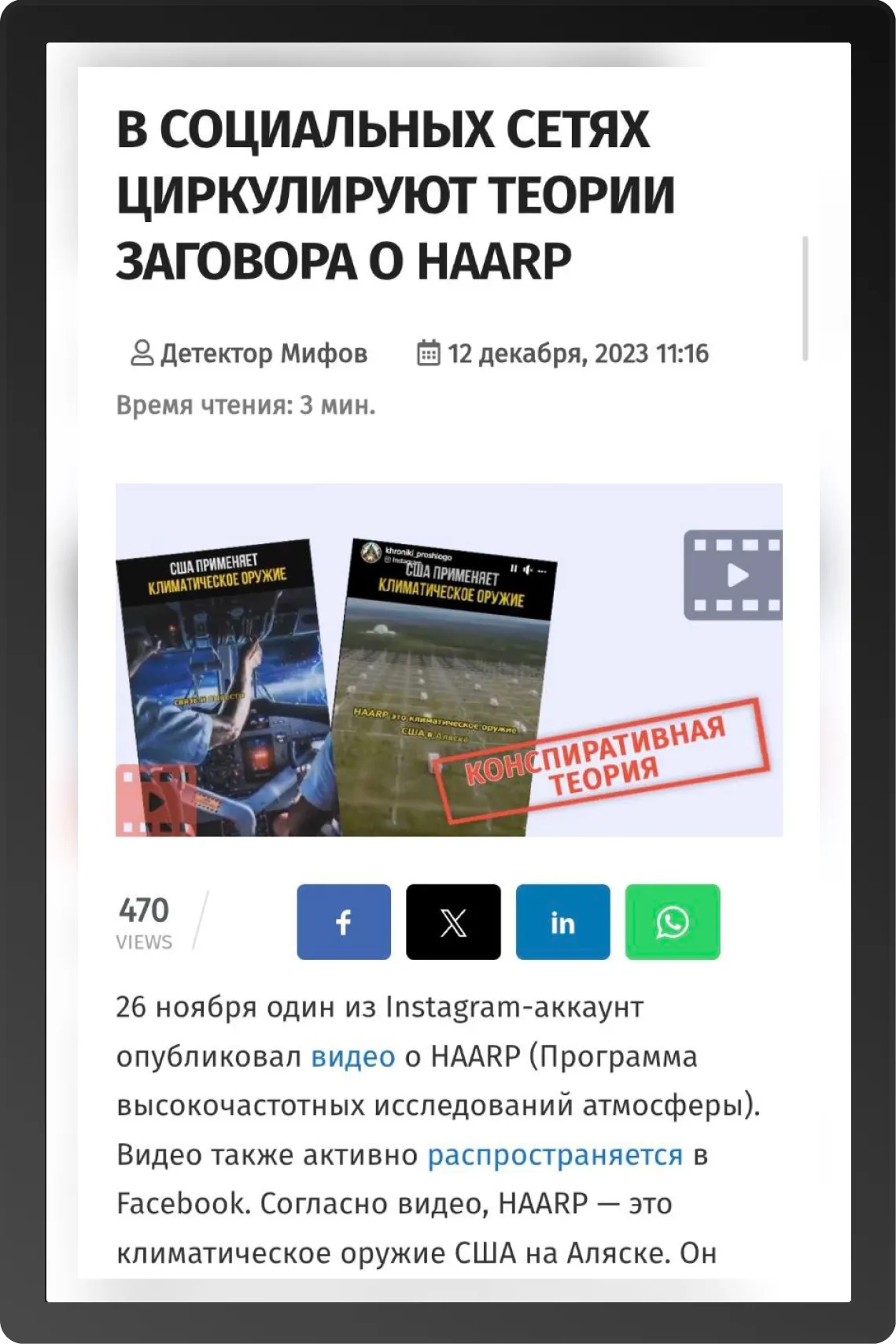 Конспирологи утверждают, что наш пучок способен нагреть ионосферу до огромных значений. На самом же деле, если сравнить мощность излучения с разрядом одной молнии, то она будет значительно меньше. А ежесекундно в атмосфере вспыхивают от 50 до 100 таких молний.