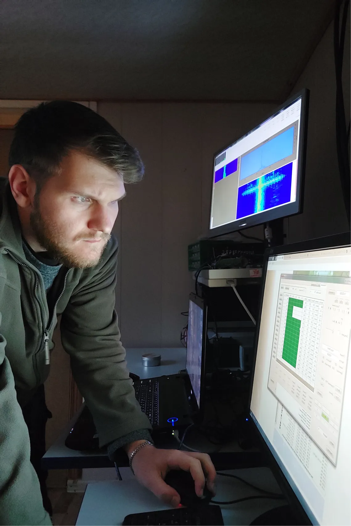 Моя лаборатория занимается изучением ионосферы с помощью радиоинструментов. Для этого мы отправляем радиолуч и смотрим, как ионосфера повлияла на его распространение. Большая часть нашего оборудования расположена на научно-исследовательских станциях за Северным полярным кругом. Аппаратура работает в автономном режиме, и постоянного присутствия человека не требуется. В среднем 1 раз в год мы выполняем техническое обслуживание, устраняем неполадки. Приезжаем, ремонтируем или, при необходимости, меняем на новое.
