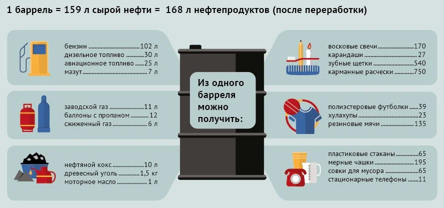 Главная часть переработанного сырья идет на производство топлива для автомобилей, самолетов, поездов и кораблей. Из нее делают пластмассы для телефонов и игрушек, синтетические волокна для одежды, воск для свечей, косметические масла и даже лекарственные препараты. Из одного барреля нефти можно произвести более 70 разных продуктов.