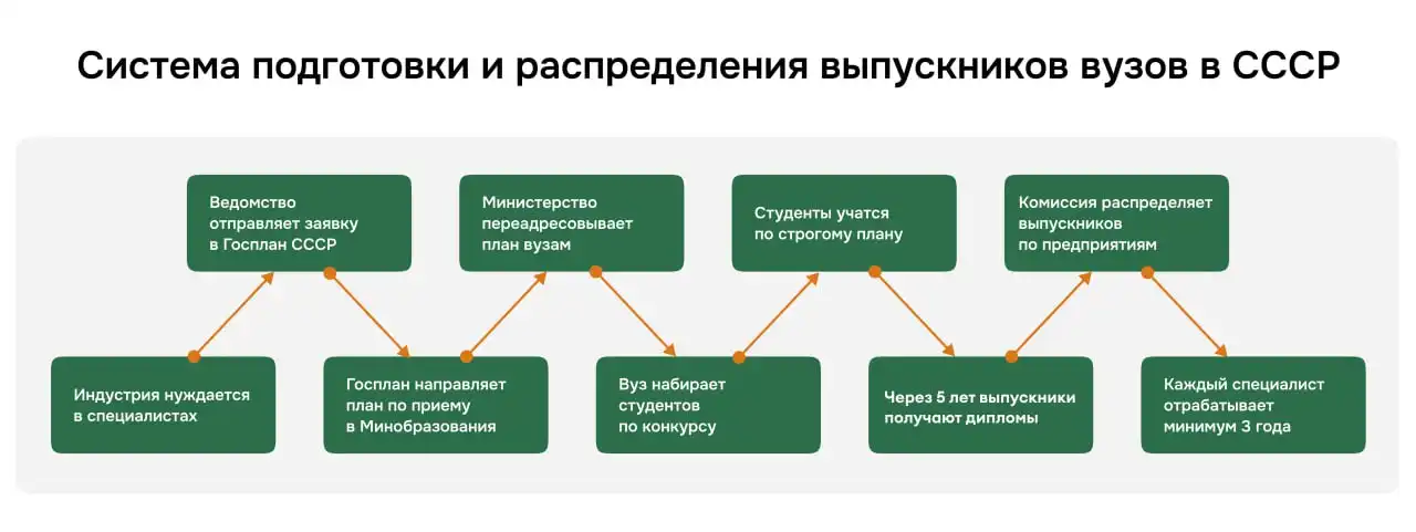 Во-первых во времена СССР страна жила в условиях плановой экономики. Государство было и поставщиком, и заказчиком кадров, оно могло спланировать, где какие заводы откроются и сколько в каком регионе потребуется специалистов. Во-вторых, скорость изменения технологий была ниже сегодняшней. Например, геолог мог 20 лет проработать в геологоразведке, в 45 прийти в вуз и еще пару десятилетий преподавать геологию студентам, делясь опытом, который всё это время оставался актуальным.