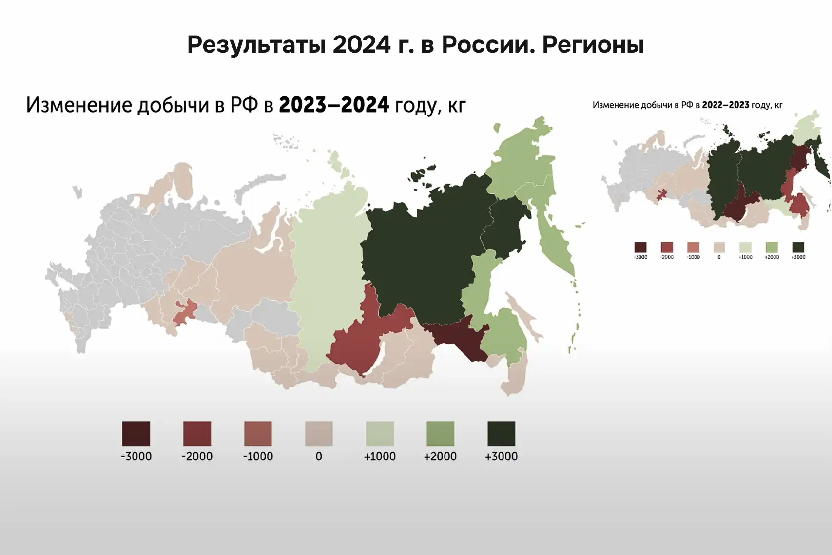 В 2023 году в категории «средней» добычи (около 20 тонн) было шесть регионов. В 2024-м их осталось пять — выпала Амурская область, показав заметное снижение. Это говорит о том, что второй эшелон регионов пока не усиливается. Тем не менее, ряд территорий находится на грани перехода в более высокую категорию — они, что называется, подпирают следующий уровень.
