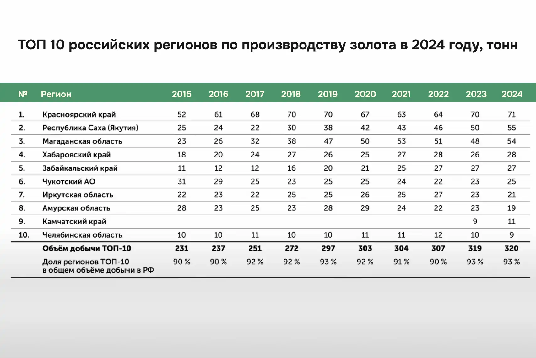 Хоть Якутия и Магаданская область продолжают меняться местами в рейтинге (в 2022 Якутия была второй, в 2023 — Магаданская, в 2024 снова Якутия). Разрыв между регионами минимален, и смена позиций — не вопрос стратегии, а результат годовых колебаний в объемах добычи. Из других заметных перемещений:
