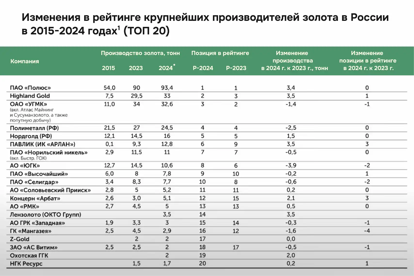 - ПАО «Полюс» уверенно сохраняет первое место: 93,4 т (+3,4 т к прошлому году), несмотря на то, что в 2024 году компания продала ряд активов. Это значит, что рост на оставшихся площадках был даже выше.