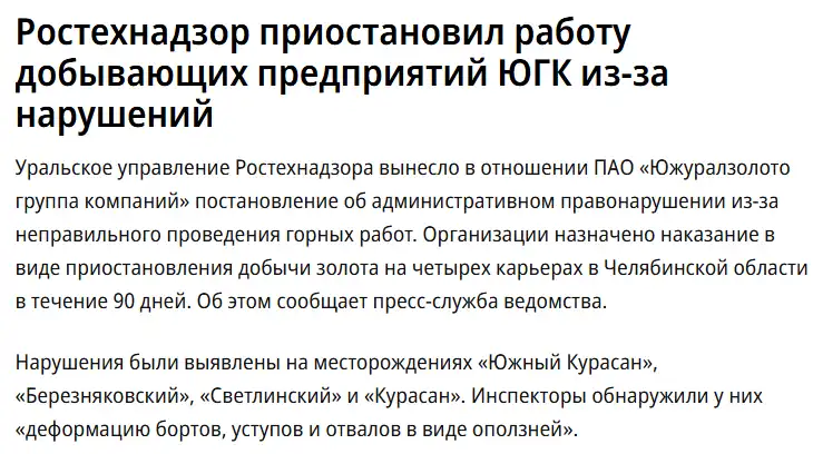 Среди негативных событий сложно не отметить приостановку добычи на Челябинских карьерах у «Южуралзолота» — на целых 90 дней. Это ощутимо ударило не только по показателям самой компании, но и по общему объему добычи в Челябинской области. Существенное влияние на отраслевые цифры оказала и авария на руднике Пионер у Атлас Майнинг, а также целый ряд других аналогичных случаев. В совокупности всё это отразилось и на общей отраслевой статистике, и на динамике роста, которая — если в прошлые годы была «резвой», — теперь замедлилась до почти незаметной.